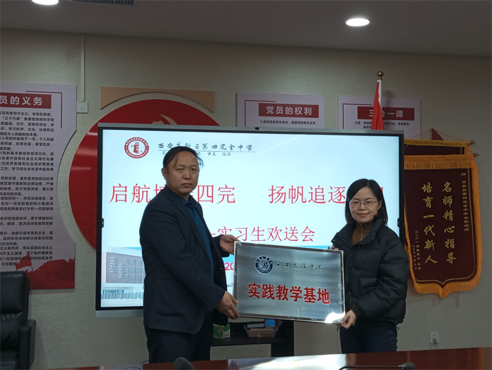 12月1日下午三点,化学工程学院教学副院长宋瑞娟、学生工作办公室副主任张莎和教育实习带队教师何亚萍一行三人赴西安市高新区第四完全中学参加实习生座谈及实践教学基地授牌活动。西安市高新区第四完全中学总务处主任高学、教务处主任任小妮、实习指导教师王维娟、刘鲜红和郭斐老师参加活动。会议由初三年级组教研组长王丹主持。
