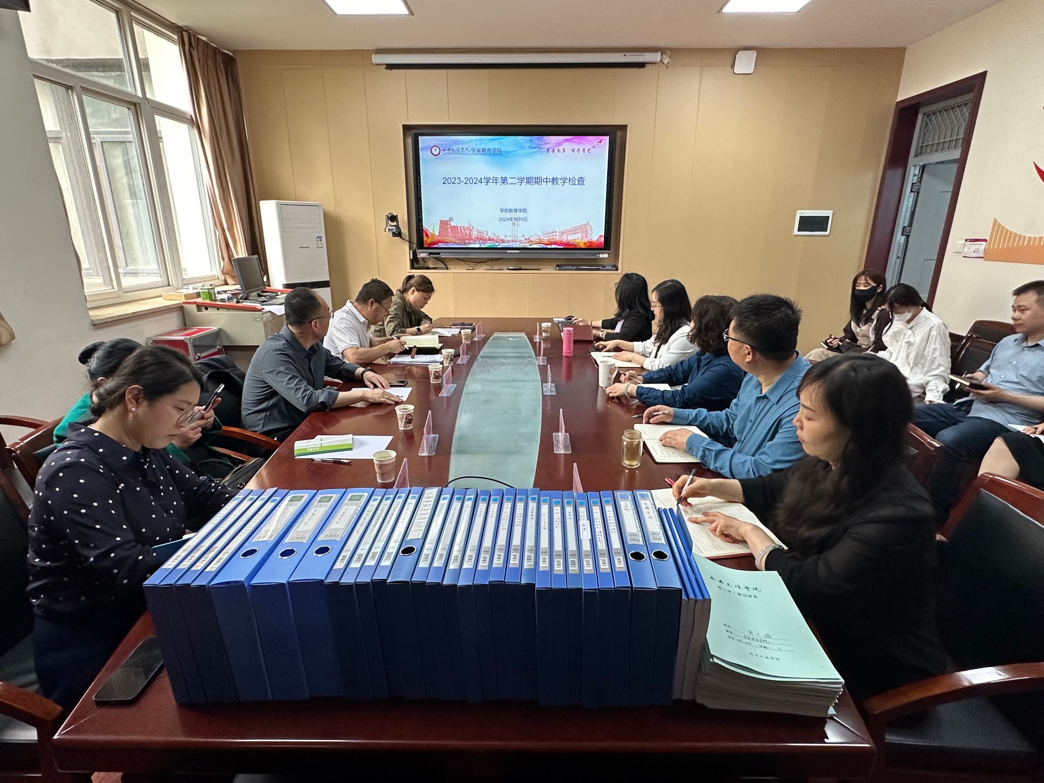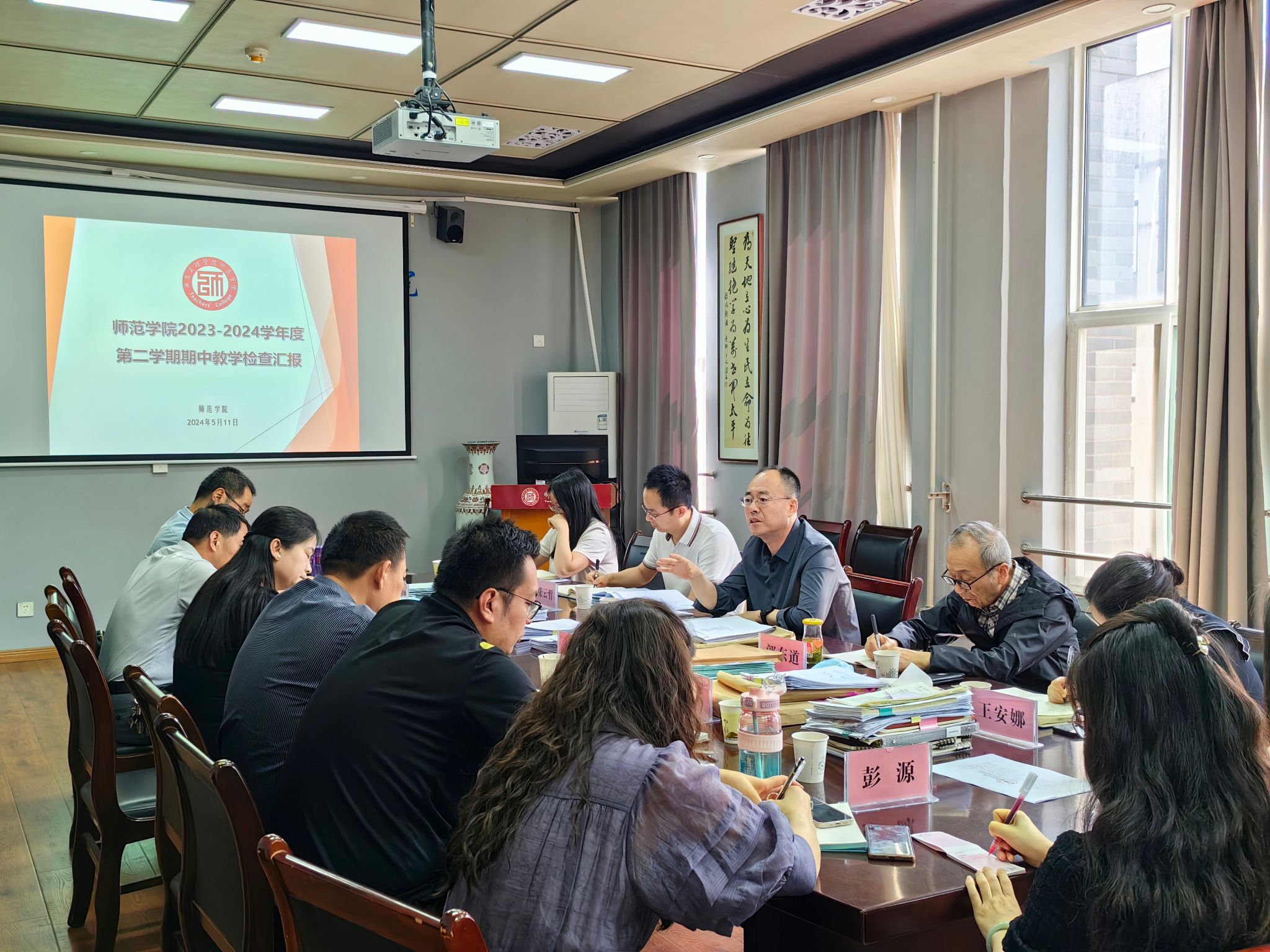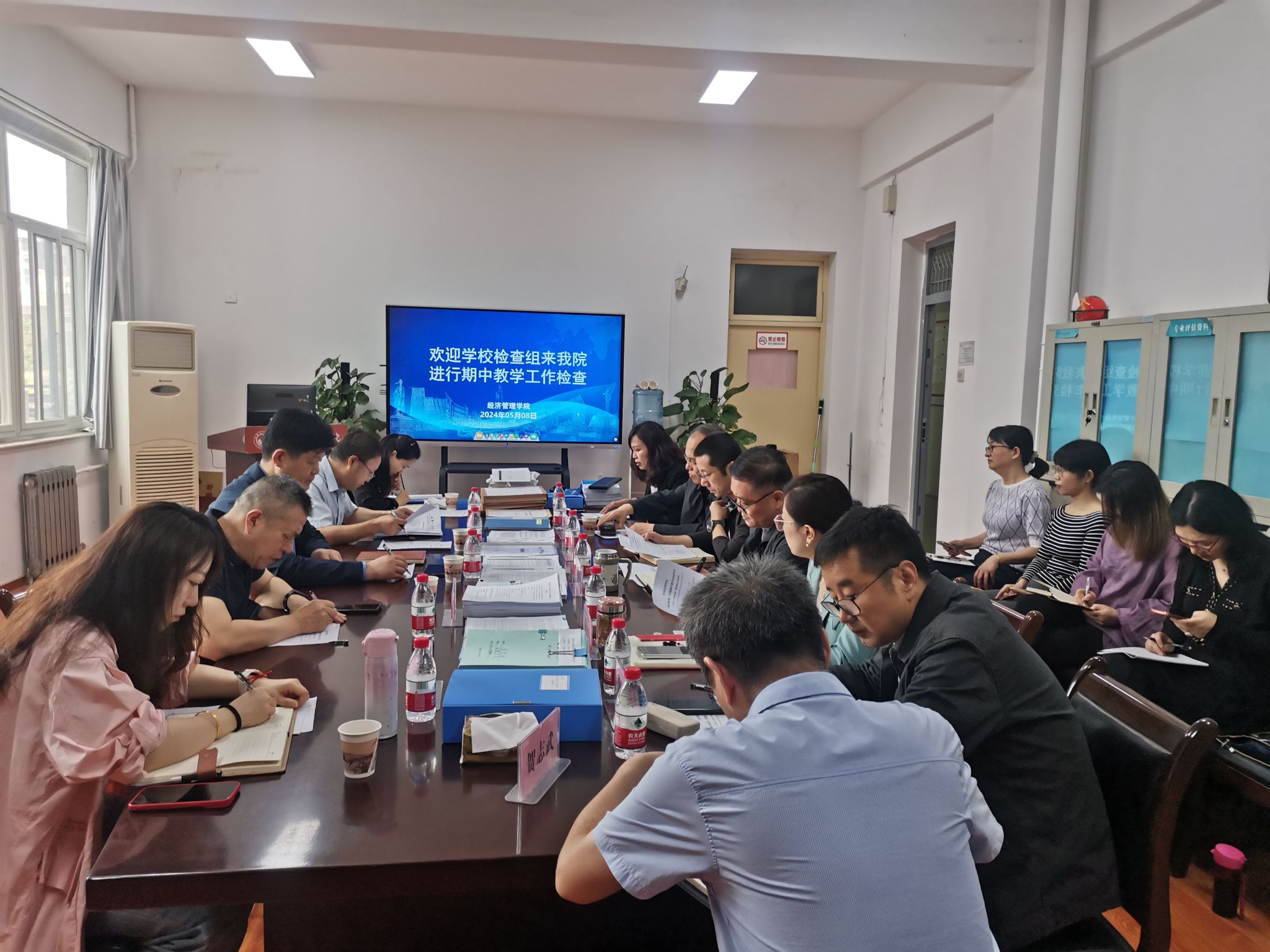 5月7日至5月11日为第二阶段,由学校检查组进行现场检查与反馈。首先,各学院介绍了本学期教学管理工作的总体情况,对学院亟待解决的教学管理问题进行了分析与探讨。随后检查组对各学院提供的教师教学材料进行逐一检查,就发现的问题对学院进行反馈并提出了改进建议,要求各学院对存在的问题进行整改,并做为下次期中教学检查的检查重点。