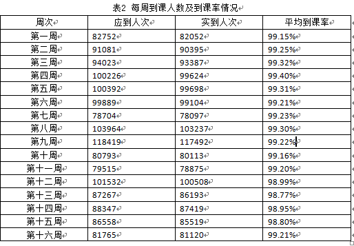 根据课程安排,应参加在线学习的学生9629人,其中第十六周应参加在线学习的学生81765人次,实际上课人数81120人次,平均到课率为99.21%。每周到课人数及到课率情况如表2所示。