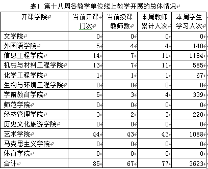 自2月24日以来,我校2020年春季学期线上教学已开展十八周。在校党委正确领导和广大师生共同努力下,本学期线上教学工作总体上运行平稳、有序进行。现将第十八周的线上教学运行情况汇总如下: