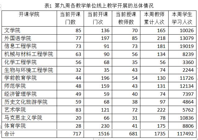 自2月24日以来,我校2020年春季学期线上教学已开展九周。在校党委正确领导和广大师生共同努力下,新学期线上教学工作总体上运行平稳、有序进行。现将第九周的线上教学运行情况总结如下: