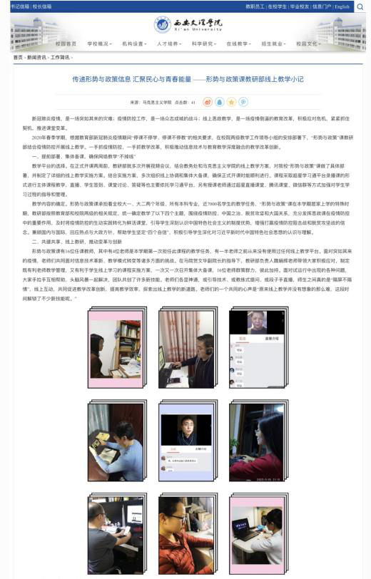 马克思主义学院形势政策见战“疫”。全院上下充分践行思政人的职业使命与担当,把握防疫期间大学生思想政治教育工作机遇和需要,迅速出台《西安德赢VWIN学院马克思主义学院防疫期间思政教育进行时活动实施方案》《西安德赢VWIN学院马克思主义学院防疫期间全校思政课在线教学实施方案》等,深入贯彻落实习近平总书记关于疫情防护工作的重要讲话精神,确定“战疫我们在一起”的形势政策第一讲主题,通过防疫阻击战引发大学生的思考,培养学生爱国主义、集体主义观念、责任与使命意识,增强践行社会主义核心价值观的情感与理性认同。