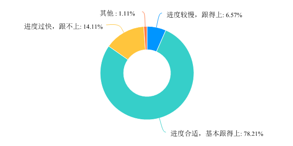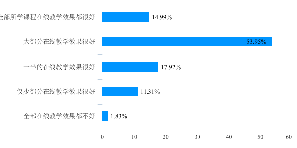 (一)在线教学质量显著提升。第二轮调查问卷结果显示,有87%的学生认为至少有一半以上的在线课程教学效果很好;78%的学生任务线上教学进度安排合适,可以跟得上教学进度和节奏。经过两个月来师生共同积极探索和及时调整,在线教学质量获得显著提升。