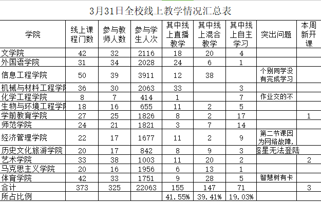 (二)以创新促发展。在确保线上教学质量不降低的基础上,各二级学院积极开拓工作思路,创新工作形式,从教学组织管理、课程建设、思政育人到实践教学环节设计、学习效果评价方式创设等各个方面积极探索,不断推进在线教育工作持续改进提升,全力推动防疫期间教育教学各项目标任务达成。