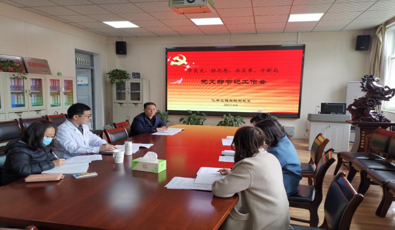 为深入开展党史学习教育,化学工程学院3月24日召开院领导领导党史学习教育专题会,4月6日召开了党支部书记党史学习专题会,4月7日组织全体党员教师学习习近平总书记在党史学习教育动员大会上的讲话精神,教育部党史学习教育动员大会精神,解读了党总支党史学习教育实施方案,为进一步学院推进党史学习教育打下坚实基础。