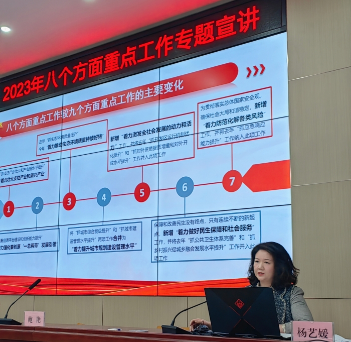 音乐学院院长杨艺媛对2023年西安市八个方面重点工作出台的背景及任务做了详细的解读,并结合西安德赢VWIN学院建设“最懂西安”的高水平应用型城市大学发展目标,对标新目标、新要求、新部署,引导广大师生以八个方面重点工作为“任务书”和“施工图”,“逆向设计、正向施工”,充分发挥专业优势,为全面推进落实八个方面重点任务做出积极贡献。