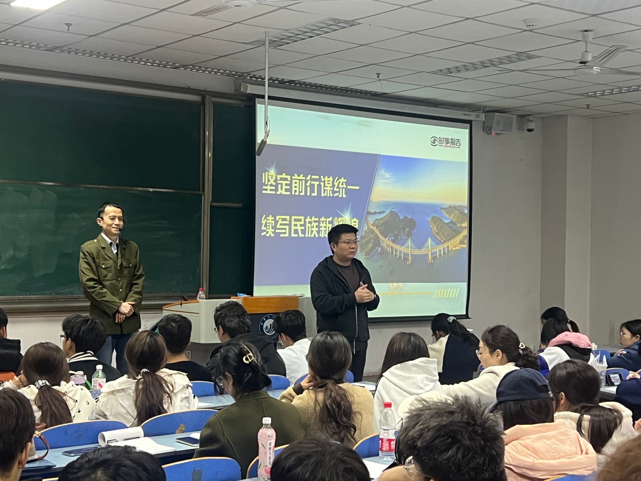 范雪峰将党的二十届三中全会精神、习近平总书记对青年的深情寄语与《形势与政策》课程教学内容相结合,通过细致的讲解和丰富的案例引导学生全面把握习近平总书记就两岸关系发表的重要讲话的丰富内涵,准确理解党中央对台工作的方针政策,引导学生在国家统一、民族复兴中展现青年担当,既是一堂生动的思政课,更是一堂深刻的党课。学生们谈到,通过本次学习,他们对两岸关系、党中央对台工作的方针政策以及如何在日常中做到维护国家统一、坚决反对分裂有了更加深入的认识和感触。