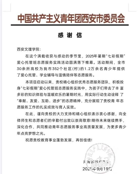 近日,共青团西安市委员会表彰了在2025年“七彩假期”志愿服务实践活动中表现突出的单位,我校团委荣获“特别支持单位”荣誉称号,得到共青团西安市委员会的高度评价与诚挚赞扬。