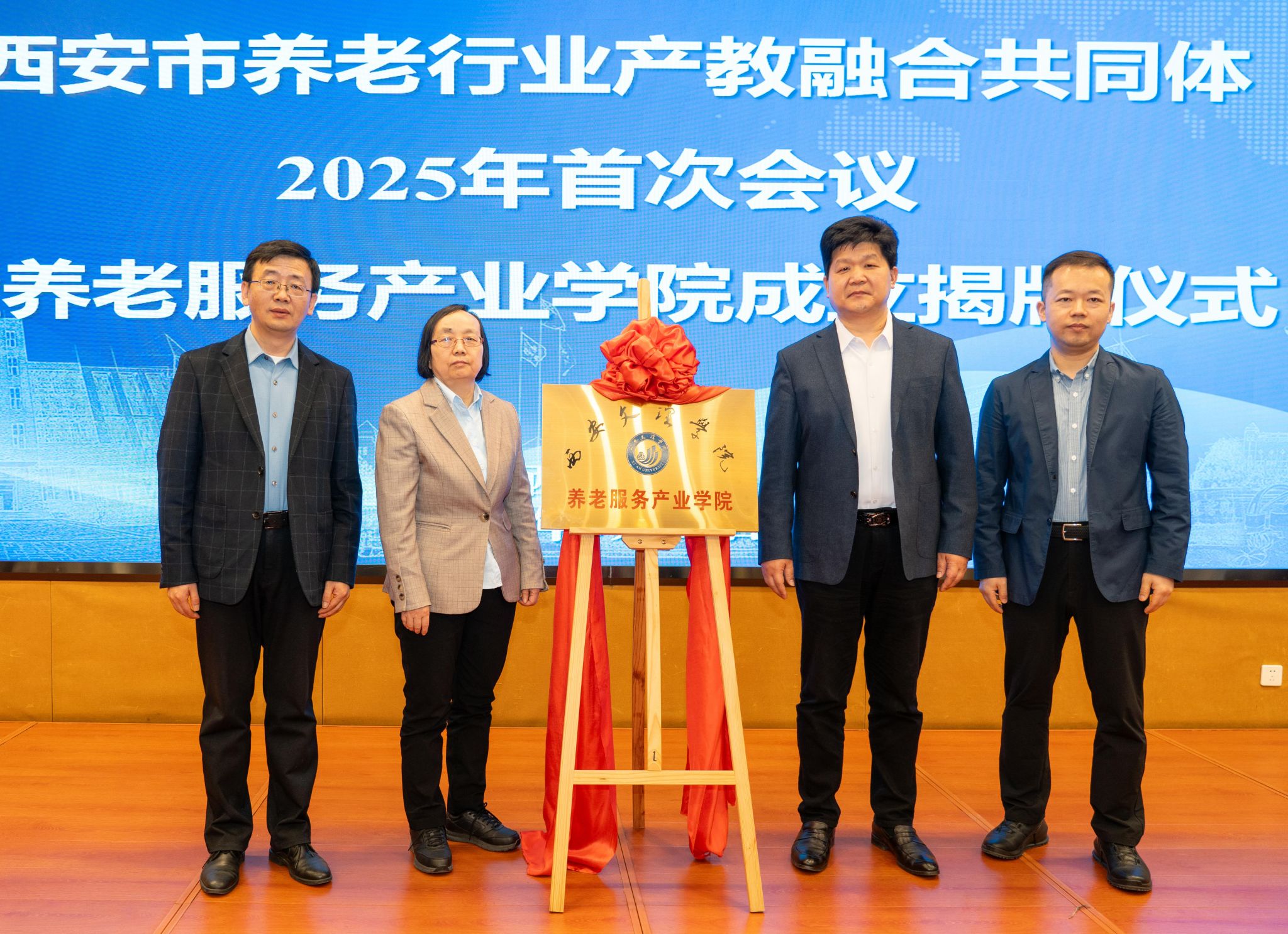 3月26日,西安市养老行业产教融合共同体2025年首次会议暨养老服务产业学院成立揭牌仪式在我校举行。陕西省民政厅二级巡视员康苏芳、养老服务处处长高静,西安市民政局副局长苏杉、养老服务处处长任明,我校副校长龚杰昌、校务委员徐东升出席,发展规划处、教务处等职能部门负责人,多家共同体成员单位和经管学院师生代表参会。校党委委员、副校长刘明利主持。