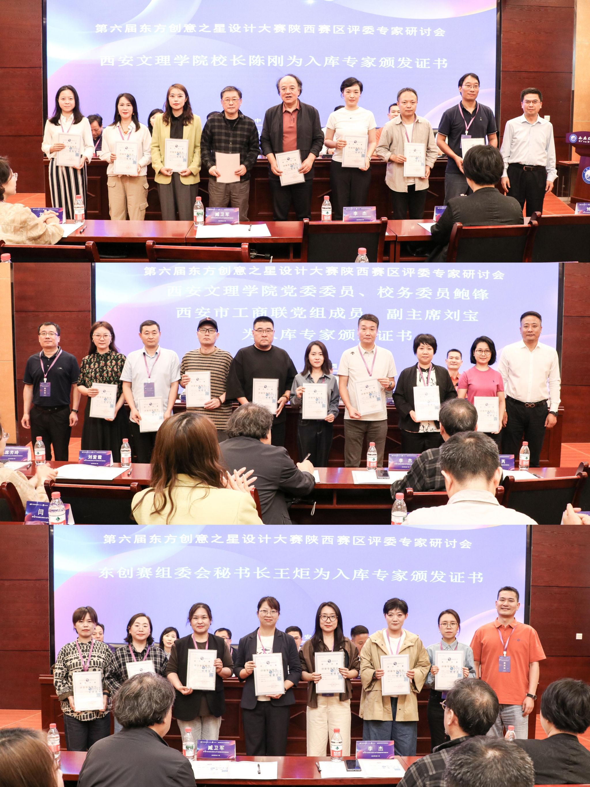 陈刚与王炬共同为“东方创意之星设计大赛陕西赛区执委会”揭牌。随后,陈刚、鲍锋、刘宝、王炬为入库专家颁发聘书。获聘入库的高校学科带头人和行业领军人物,共同探讨了设计人才培养创新路径与产教融合机制,为陕西文化创意产业升级注入新动能,为赛事专业化运作注入智库支撑。